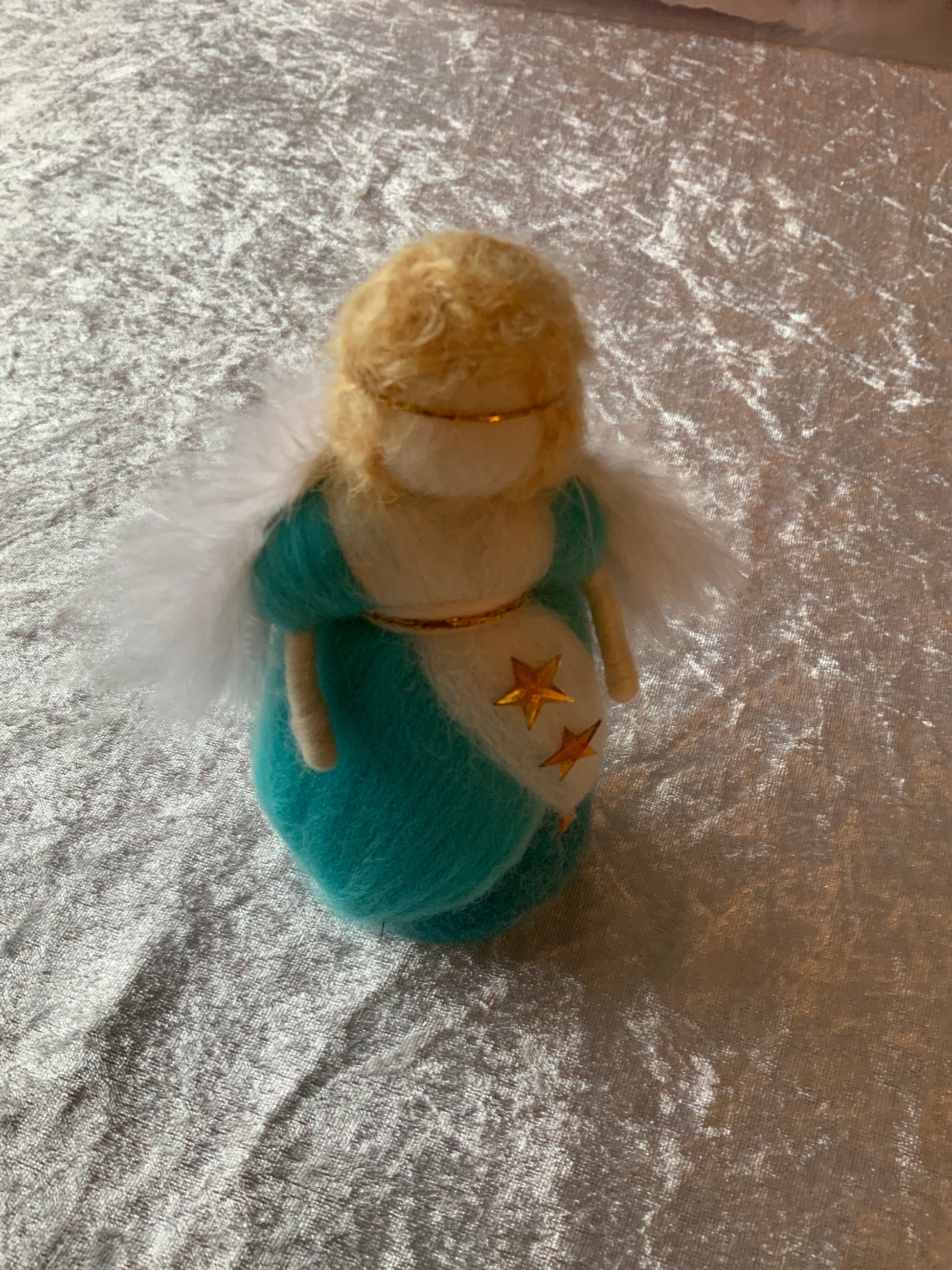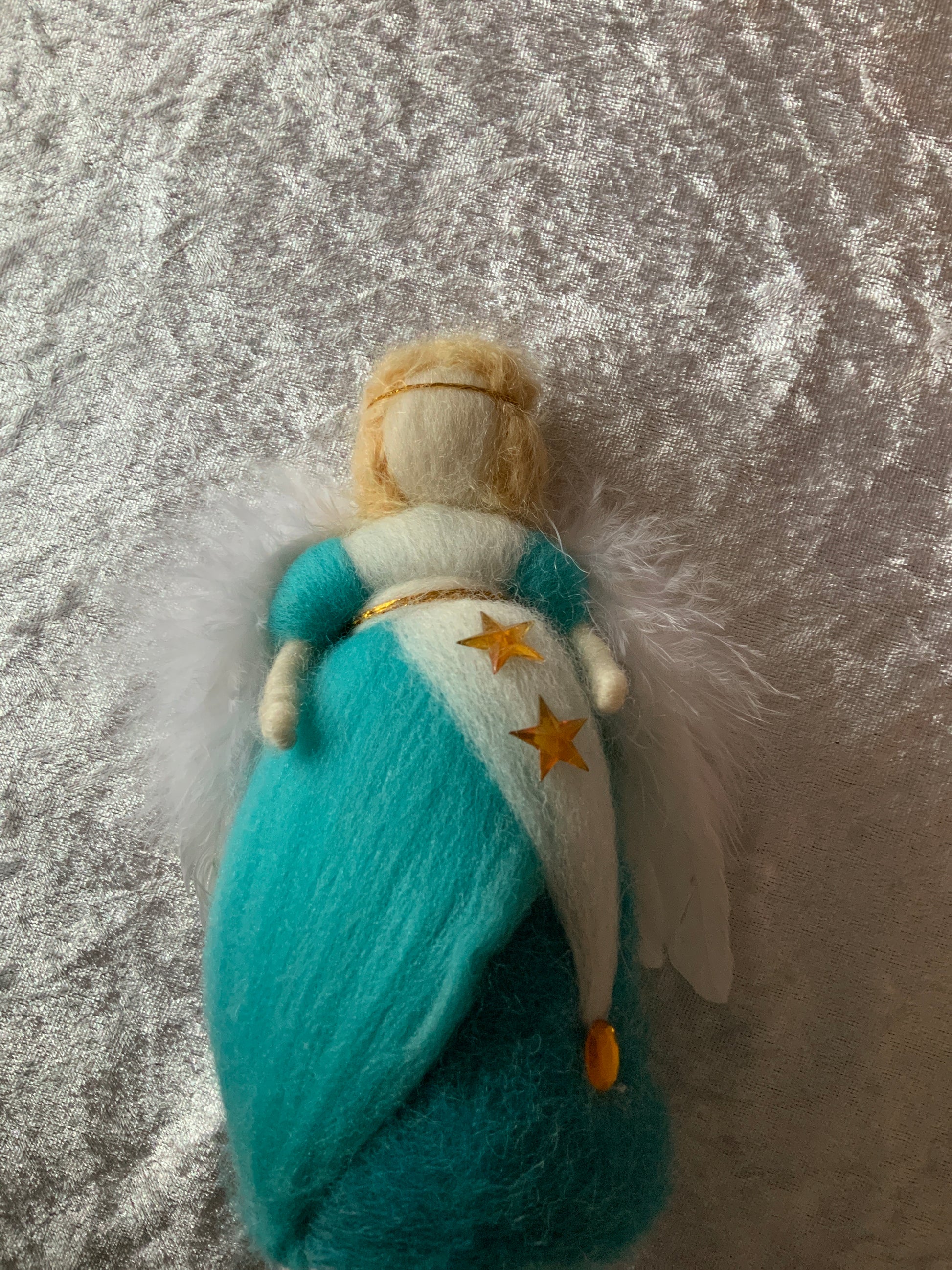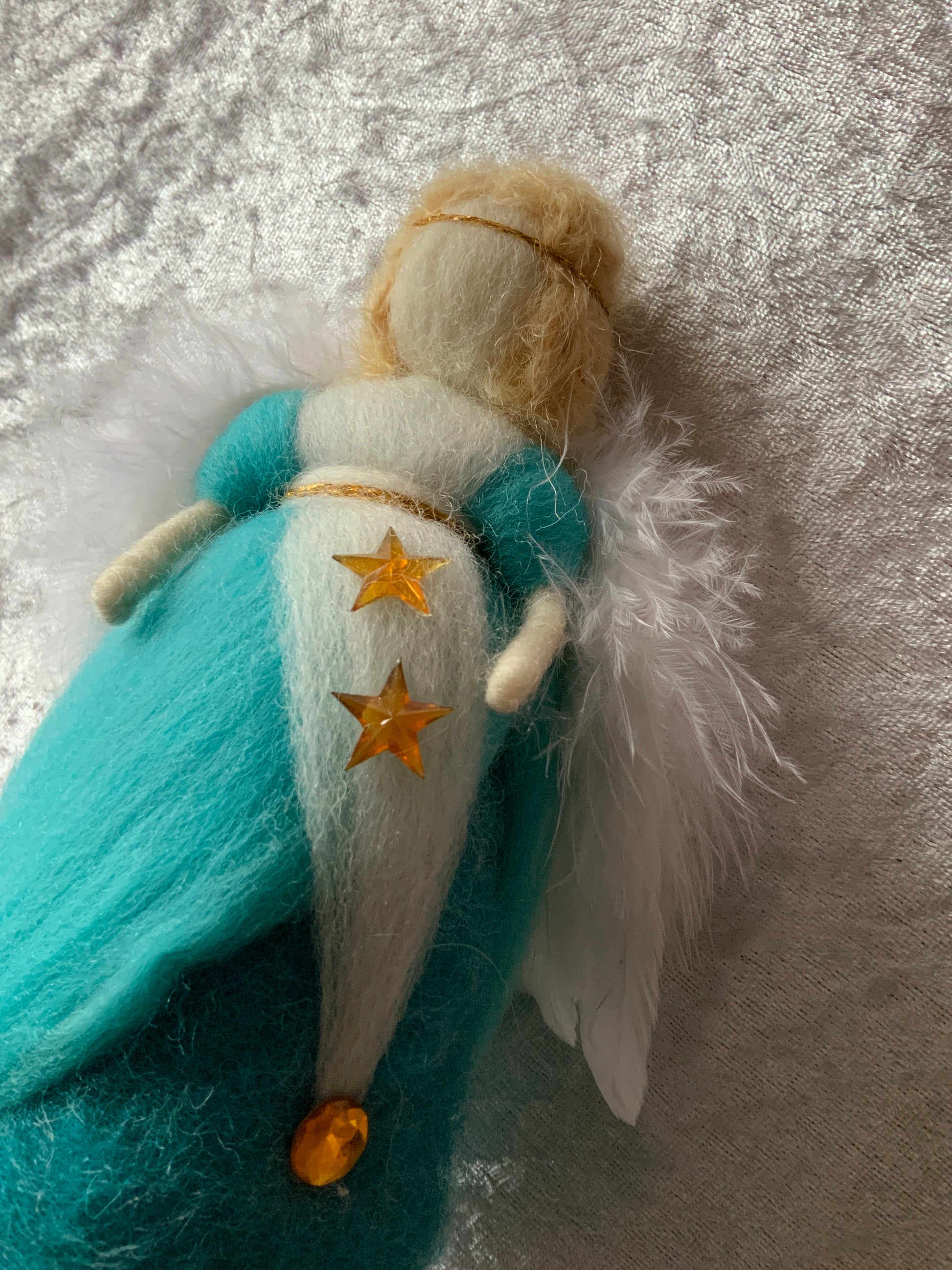 Dieser wunderschöne Engel wurde aus Merinowolle hergestellt, er hat als kleine Accessoires glitzerne Sterne und Wunderschöne große Flügel.