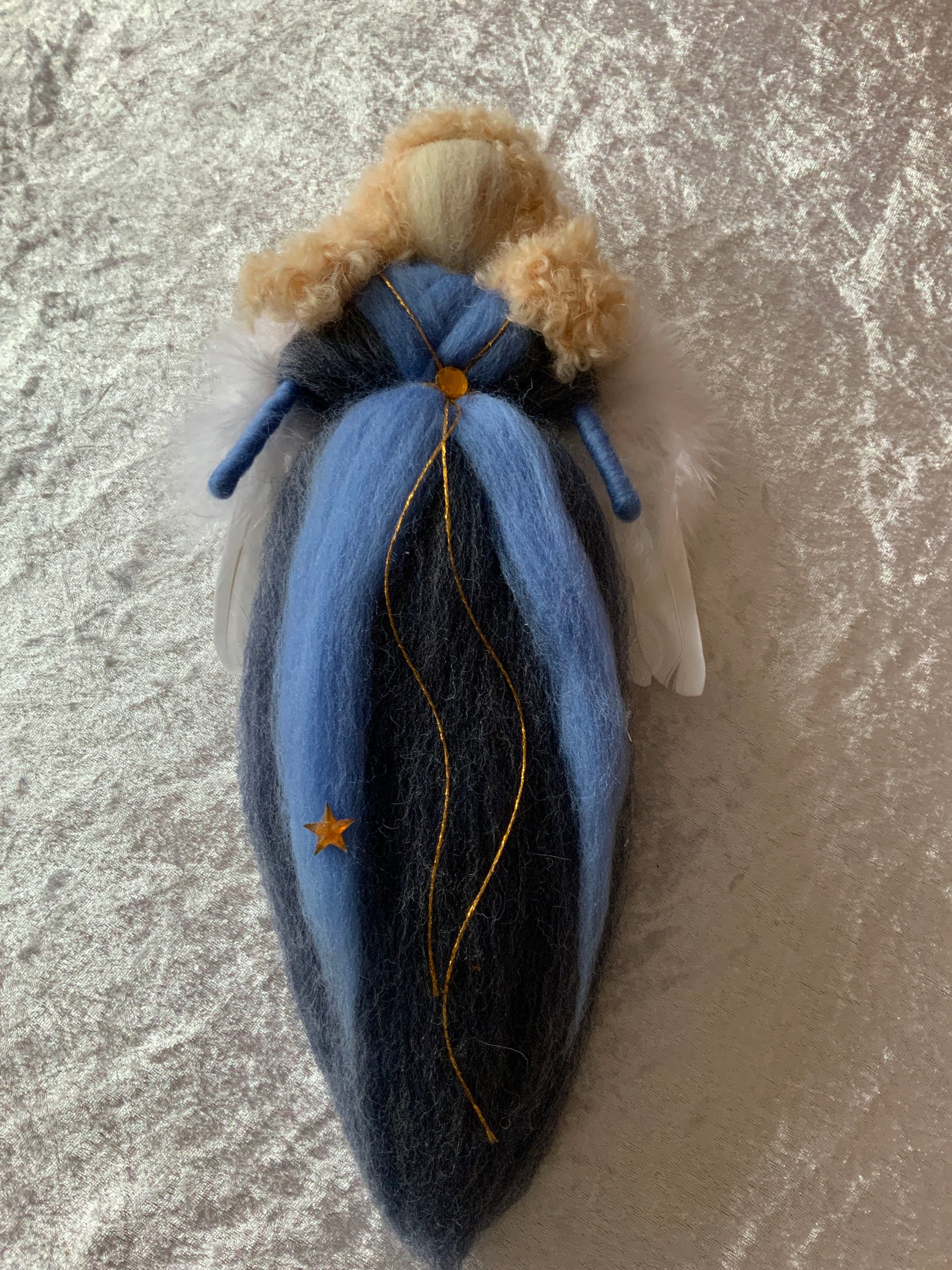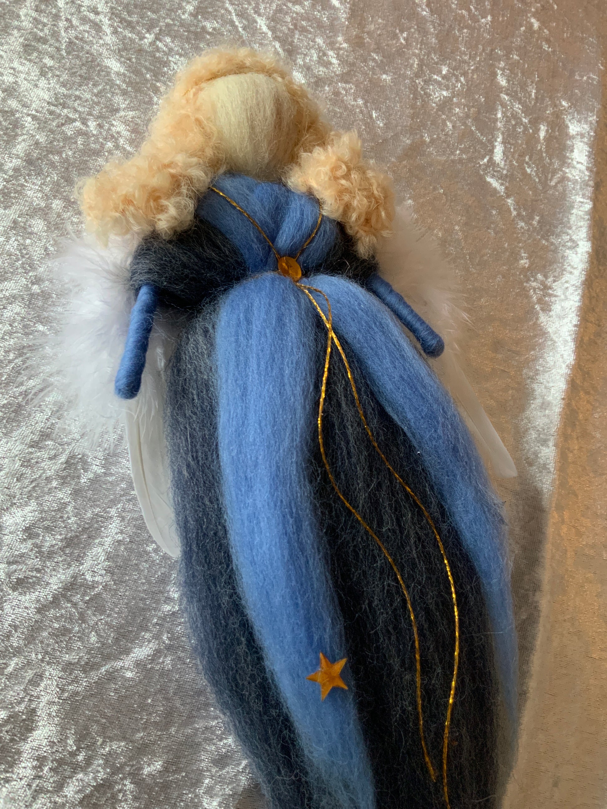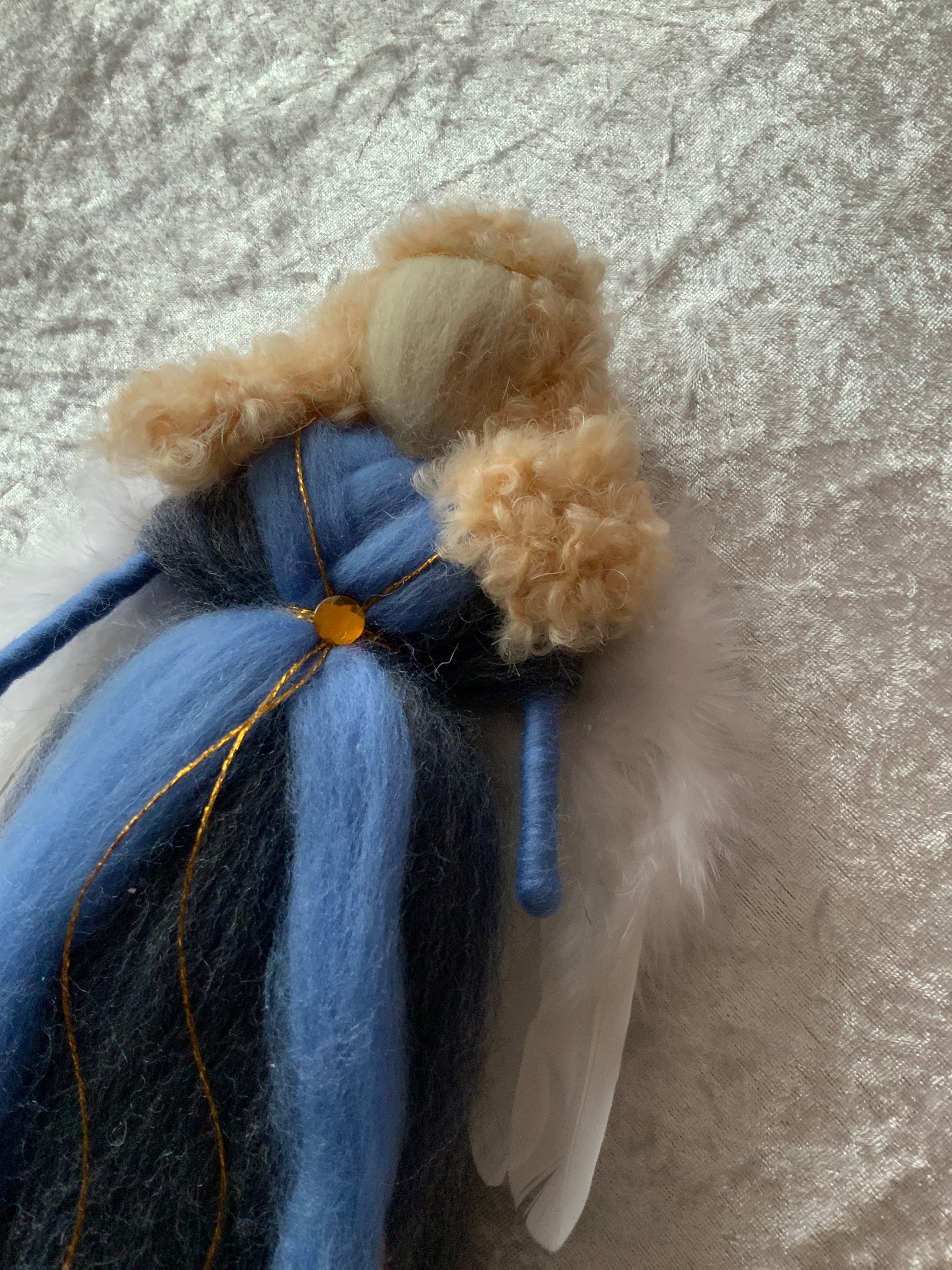 Dieser wunderschöne Engel wurde aus Merinowolle hergestellt, er hat Goldene highlights und blonde locken. Er glänzt in wunderschönen Blautönen.