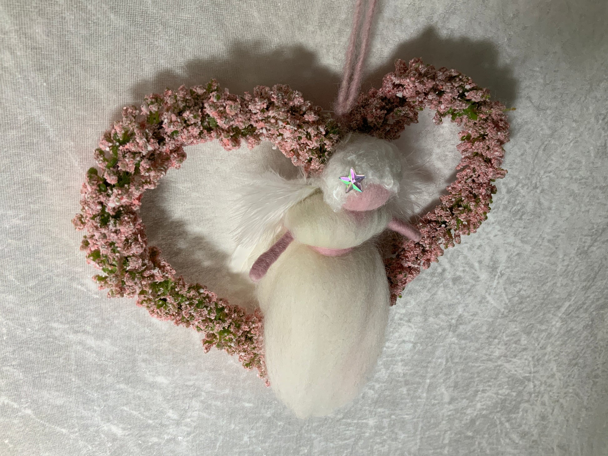 Der Engel wurde Liebevoll aus Merinowolle hergestellt und ist in der Mitte des Herzens ein wunderschöner Hingucker. Das Dekorationsobjekt ist ein wunderschönes Geschenk zu jedem Anlass und kann wunderschön im Fenster, im Raum oder an der Türe dekoriert werden.