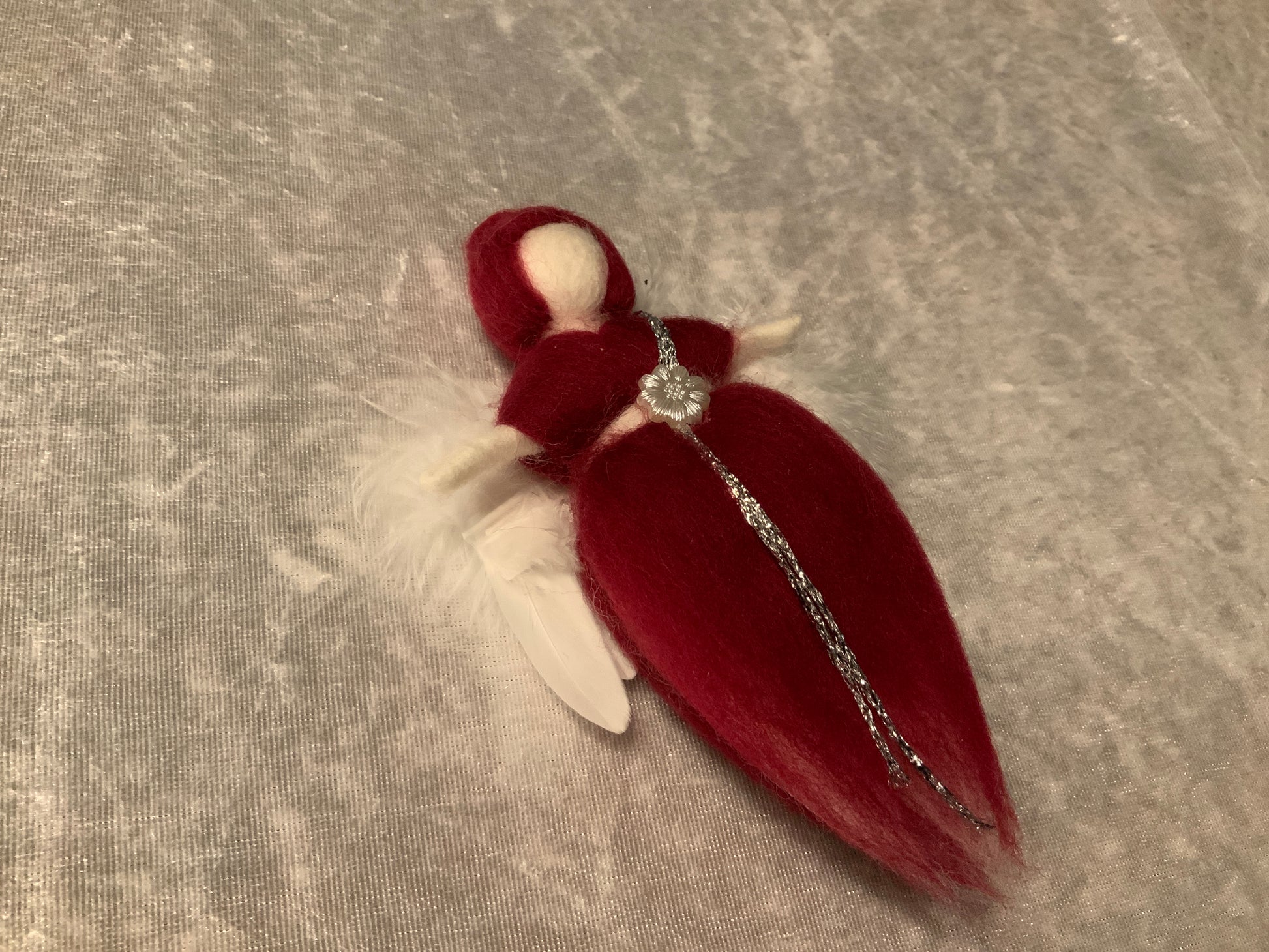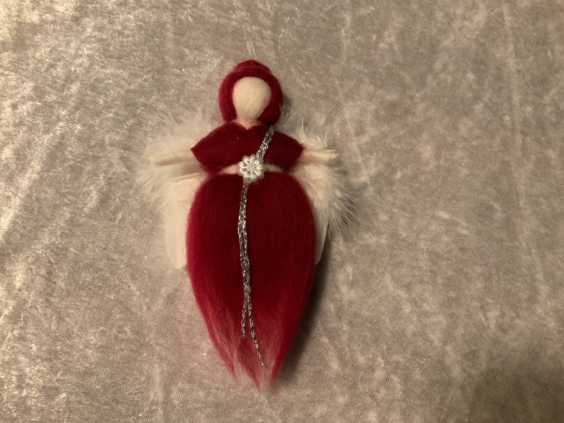 Dieser wunderschöne Engel wurde aus Merinowolle hergestellt, er glitzert in einem Bordeaux Rot Kleid und hat wunderschöne große Flügel.
