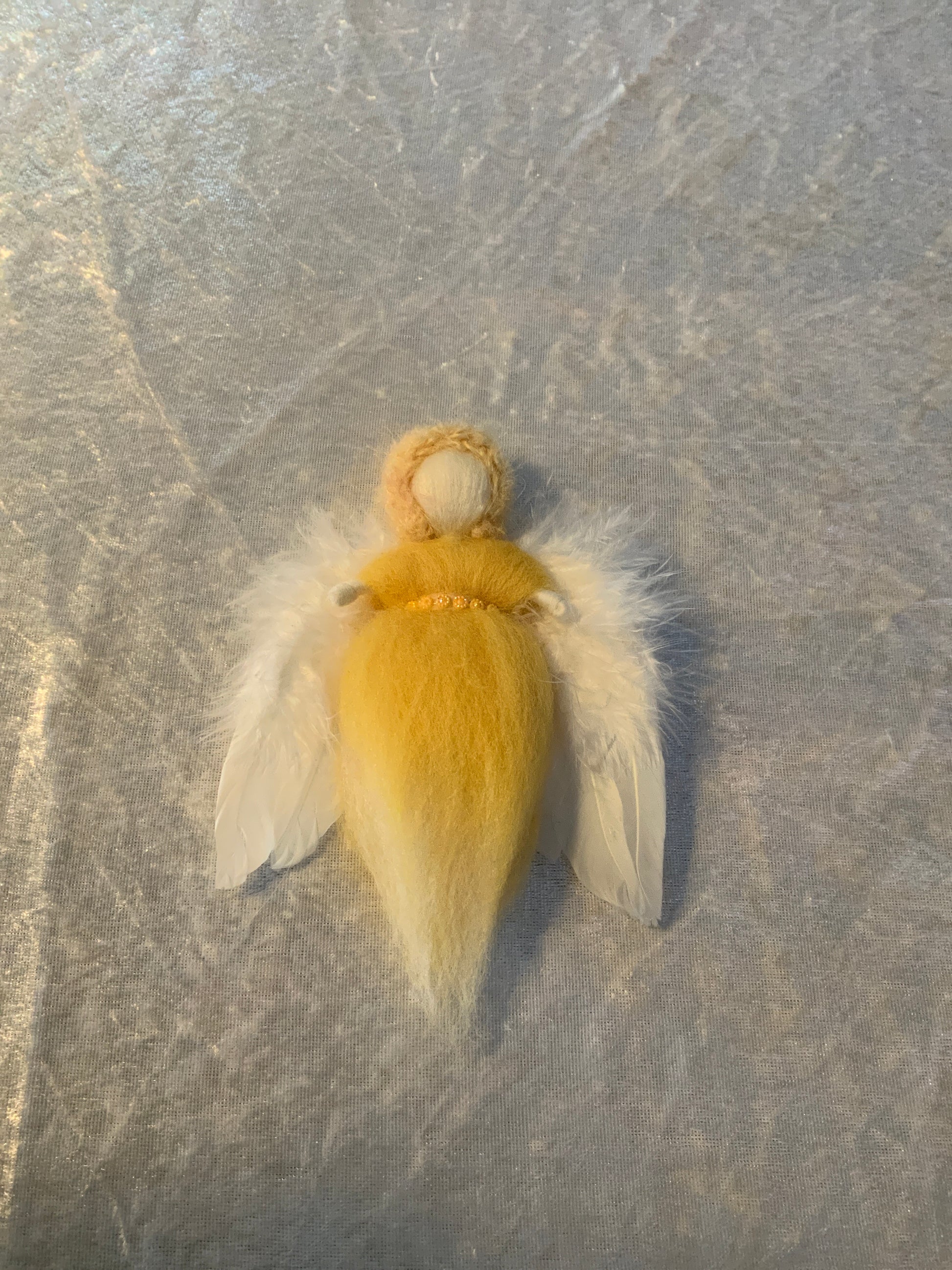 Dieser wunderschöne Engel wurde aus Merinowolle hergestellt, er glitzert in einem Gelben Kleid und hat wunderschöne große Flügel.