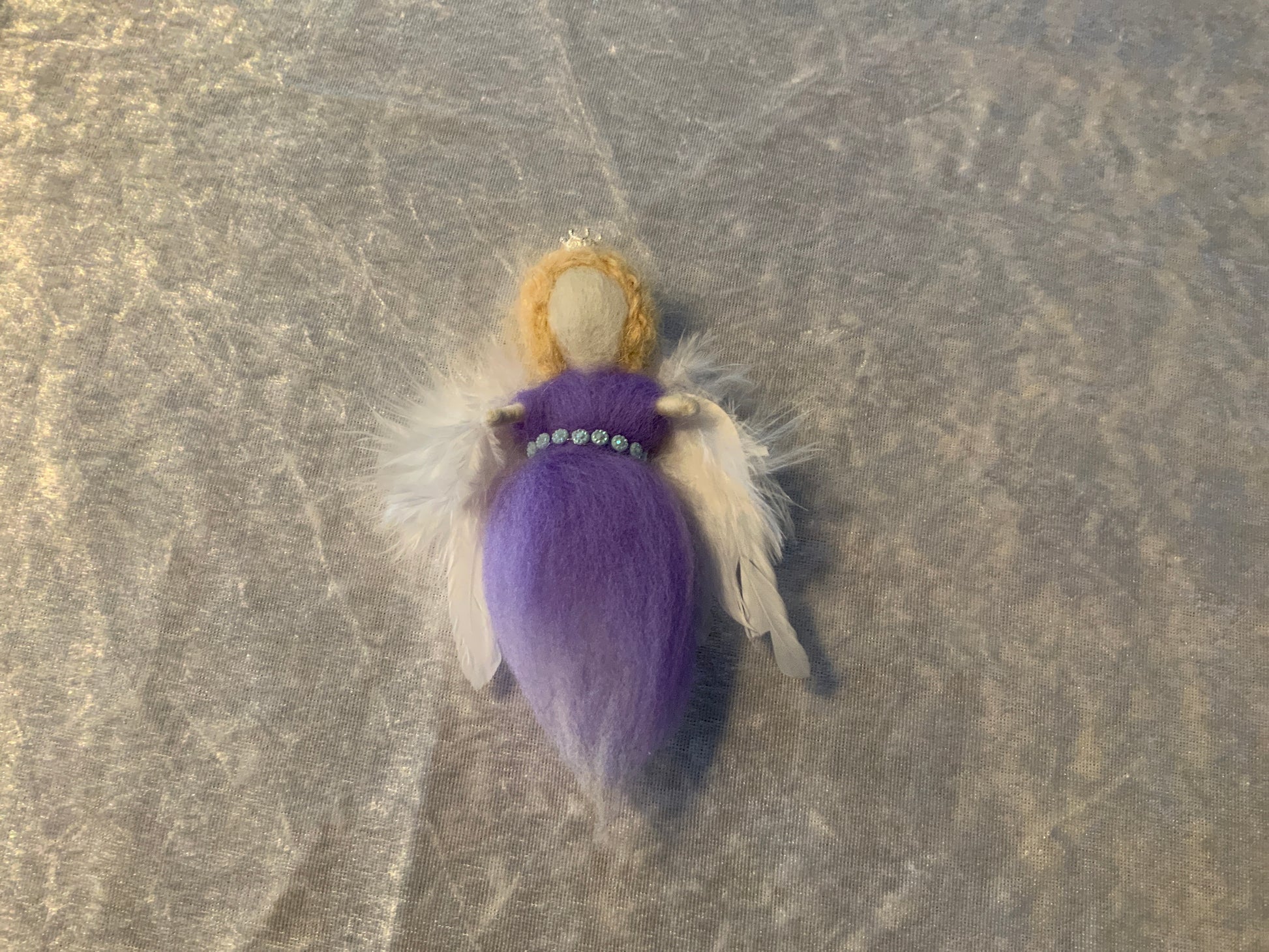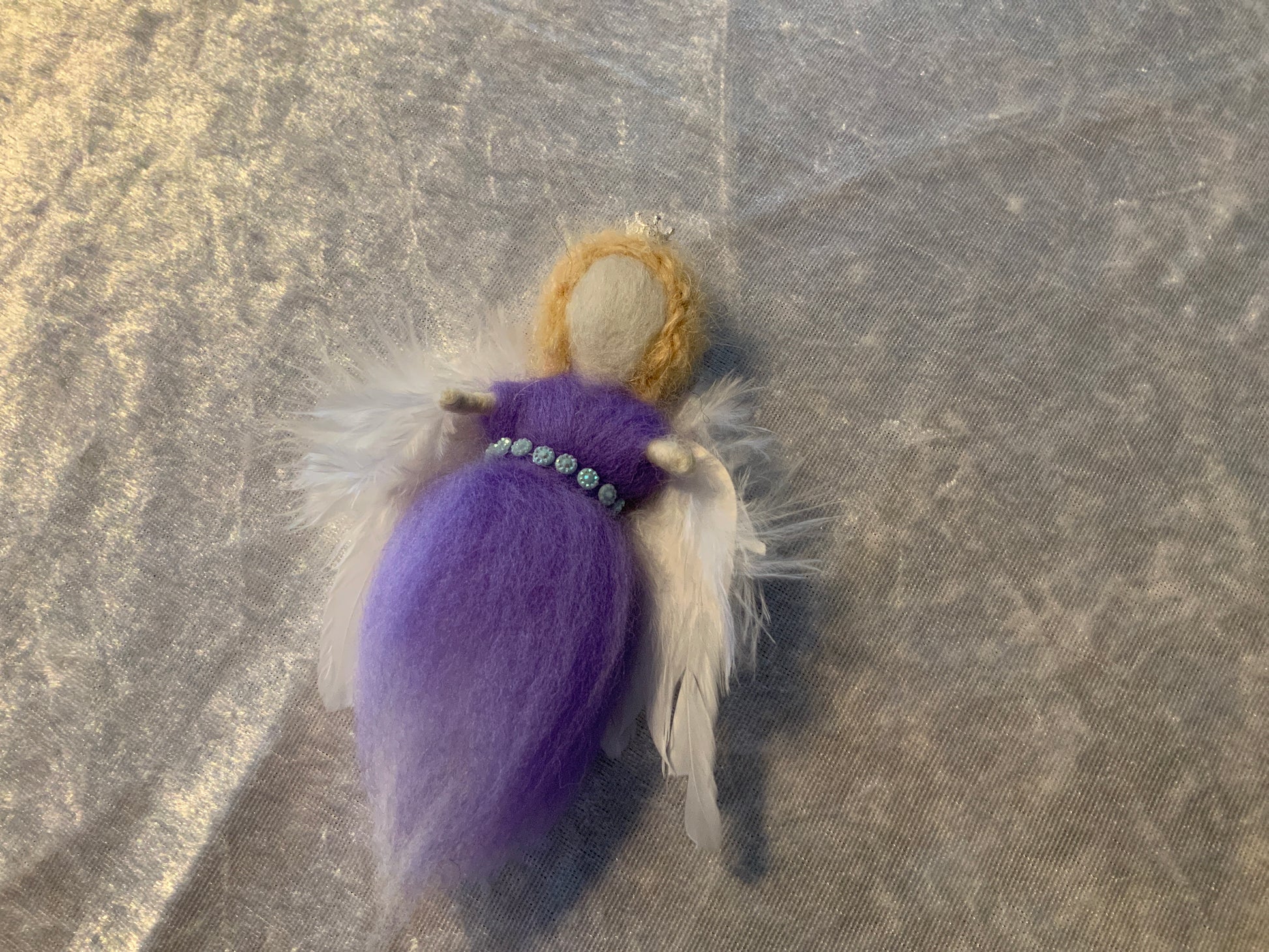 Dieser wunderschöne Engel wurde aus Merinowolle hergestellt, er glitzert in einem Lila Farbenen Kleid und hat wunderschöne große Flügel.