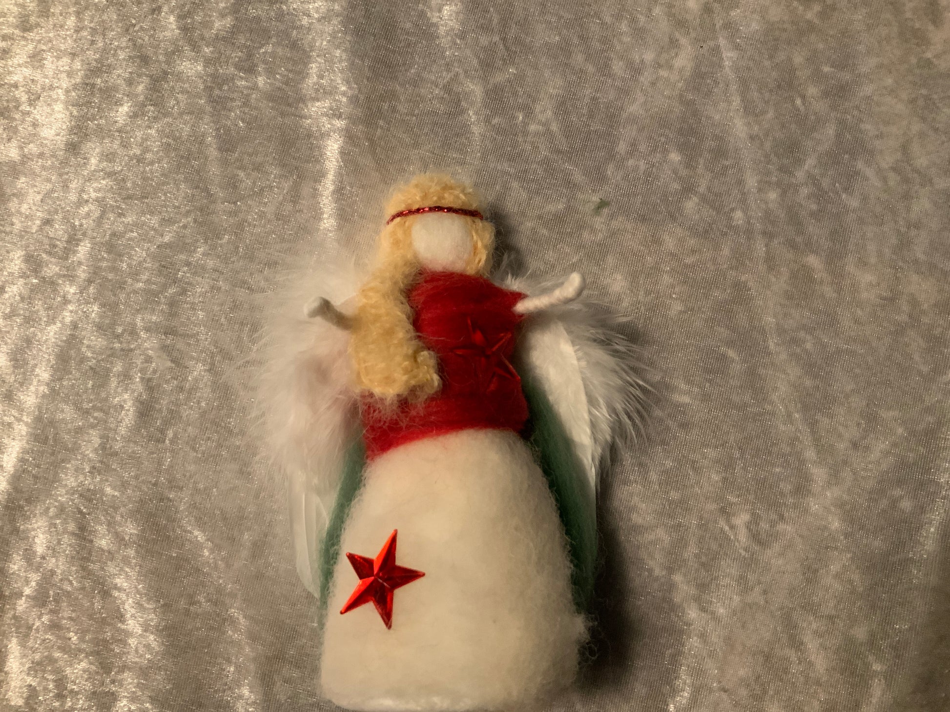 Dieser wunderschöne Engel wurde aus Merinowolle hergestellt, er hat kleine Sterne als Highlight in Rot und ein wunderschönes Kleid in Rot und Weiß.
