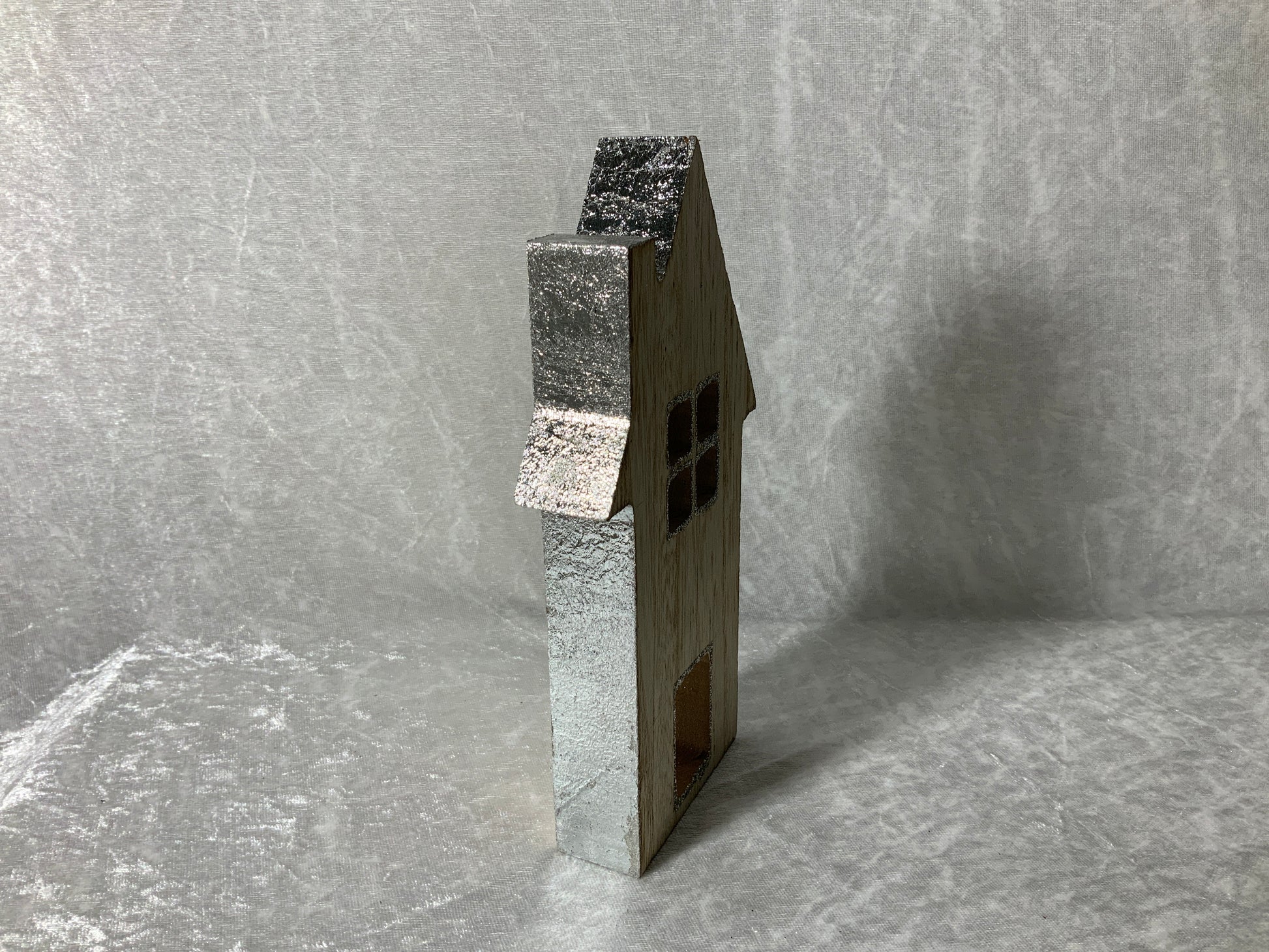 Dieses wunderschöne kleine Haus aus Holz hat eine Silberne Umrandung und ist das perfekte Dekorationsobjekt für die Weihnachtszeit.